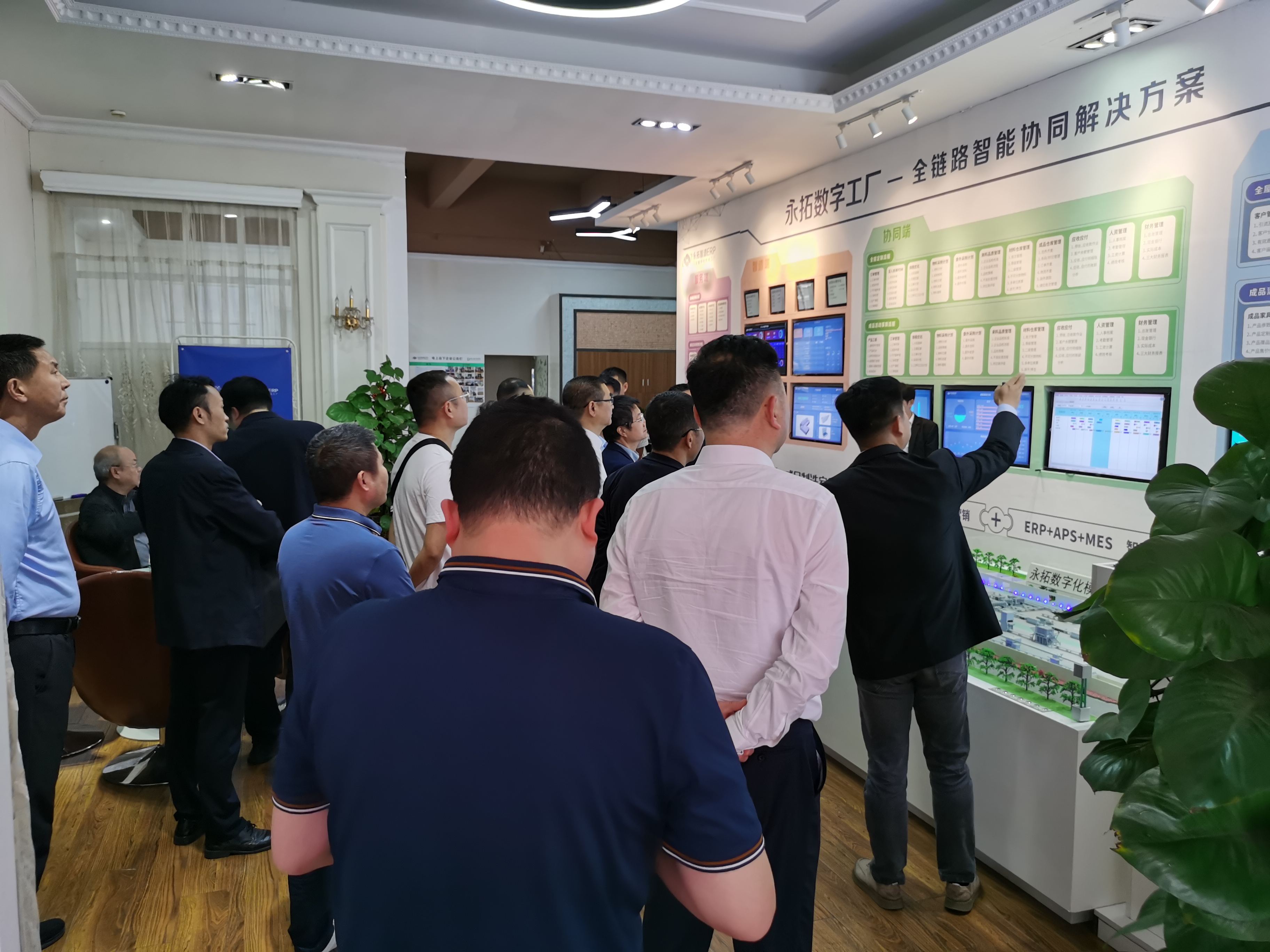 永拓数字总经理潘勇为领导详细介绍了永拓数字技术基本情况、永拓全链路智能协同解决方案、永拓数字化模拟工厂沙盘,胡聚文链长称赞连连。
