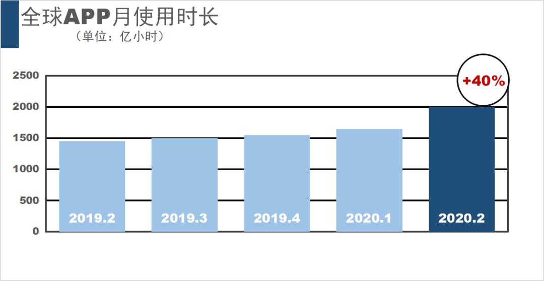 根据App Annie的数据显示,在2020年第二季度,手机APP的下载量、使用量以及用户消费水平均达到历史峰值:APP下载量数据几乎到了350亿;使用量同比增长40%,光是4月的使用总时长就超过2000亿小时。