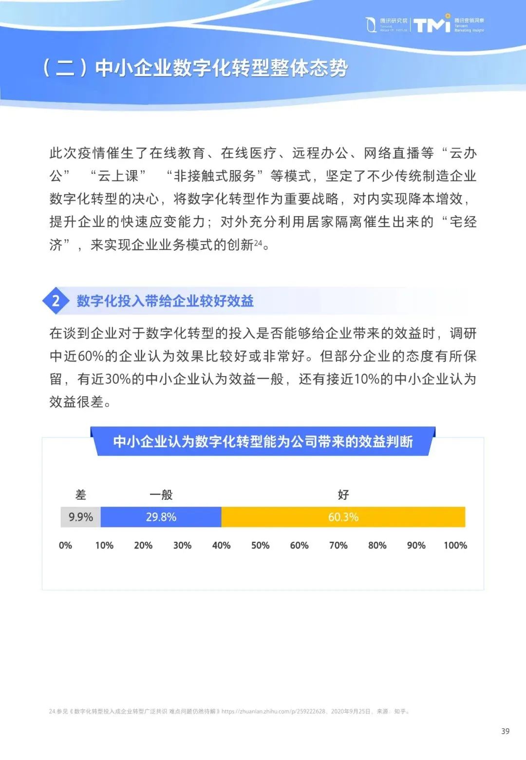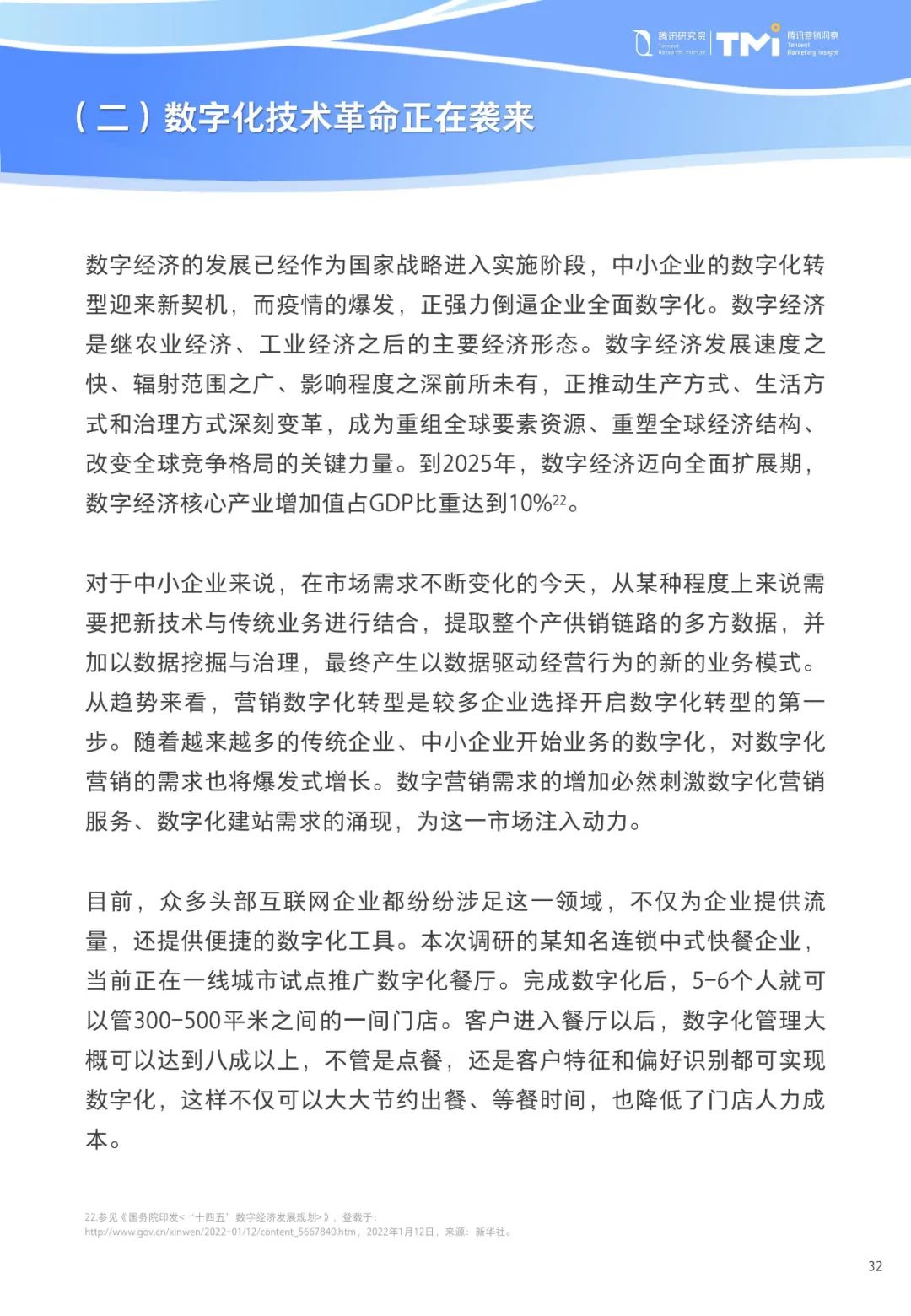 为更好地给中小企业发展提供帮助,腾讯研究院携手腾讯营销洞察(TMI)推出了《中小企业数字化转型发展研究报告(2022版)》。在“十四五”规划开篇之际,展开对中小企业数字化与转型的研究和探索,力求更好地洞察现状,同时通过总结优秀数字化转型方法论,希望帮助更多的中小企业发现新时代机遇,不断提升企业效益和品牌传播的能力。