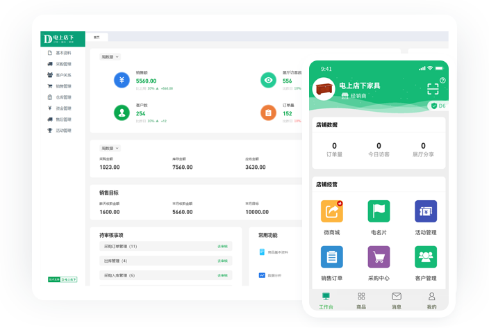 通过电上店下,快速地帮您搭建专属的订货商城平台,电脑、APP、微信小程序一次性拥有。通过订货端展示您的商城和商品,让客户自主下单以客户订单快速驱动企业销售、仓库、采购、财务等企业内部环节运转起来。